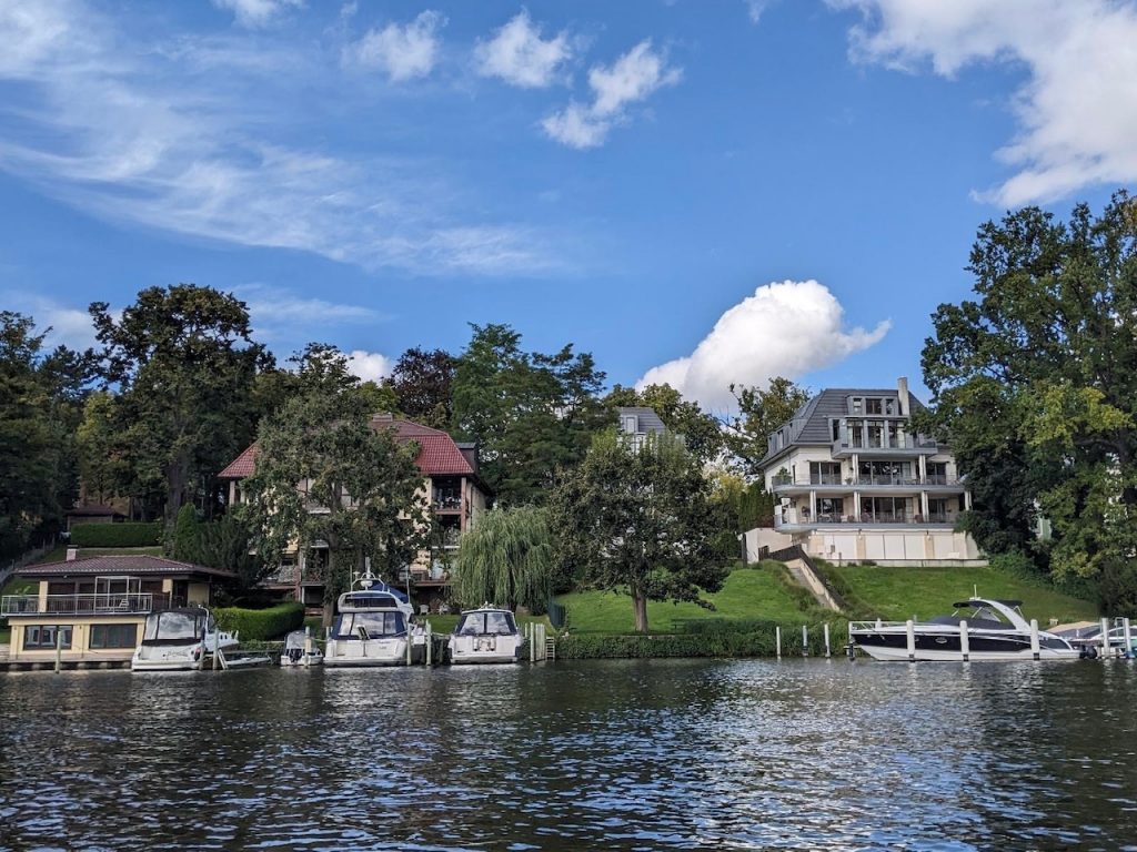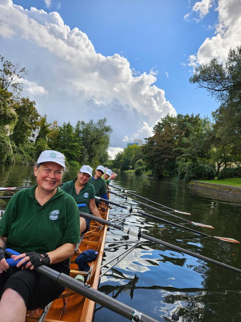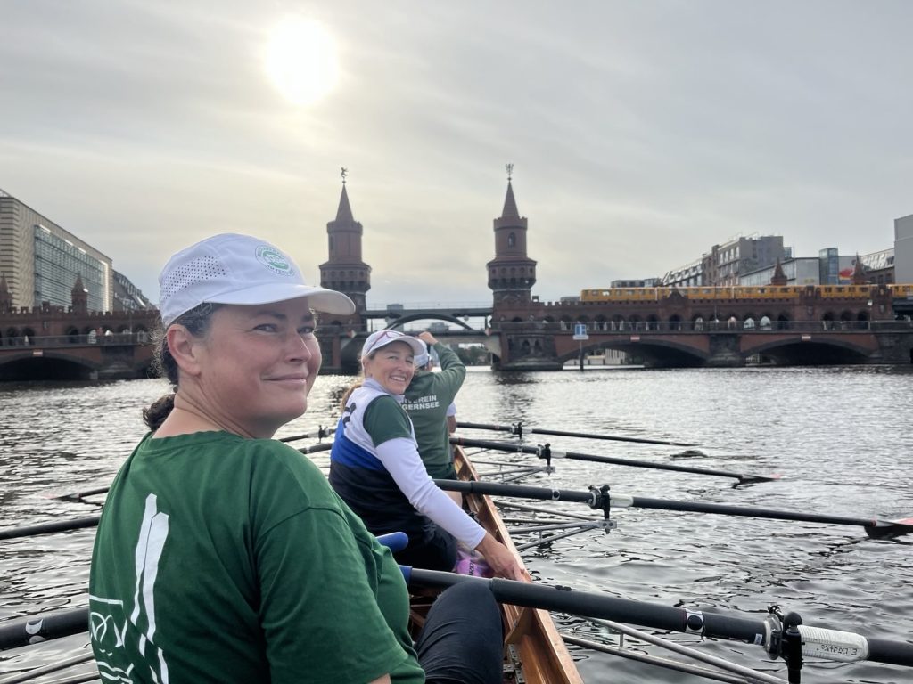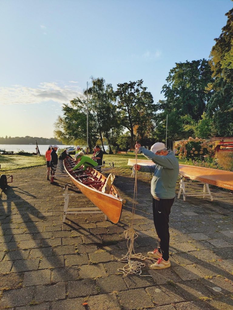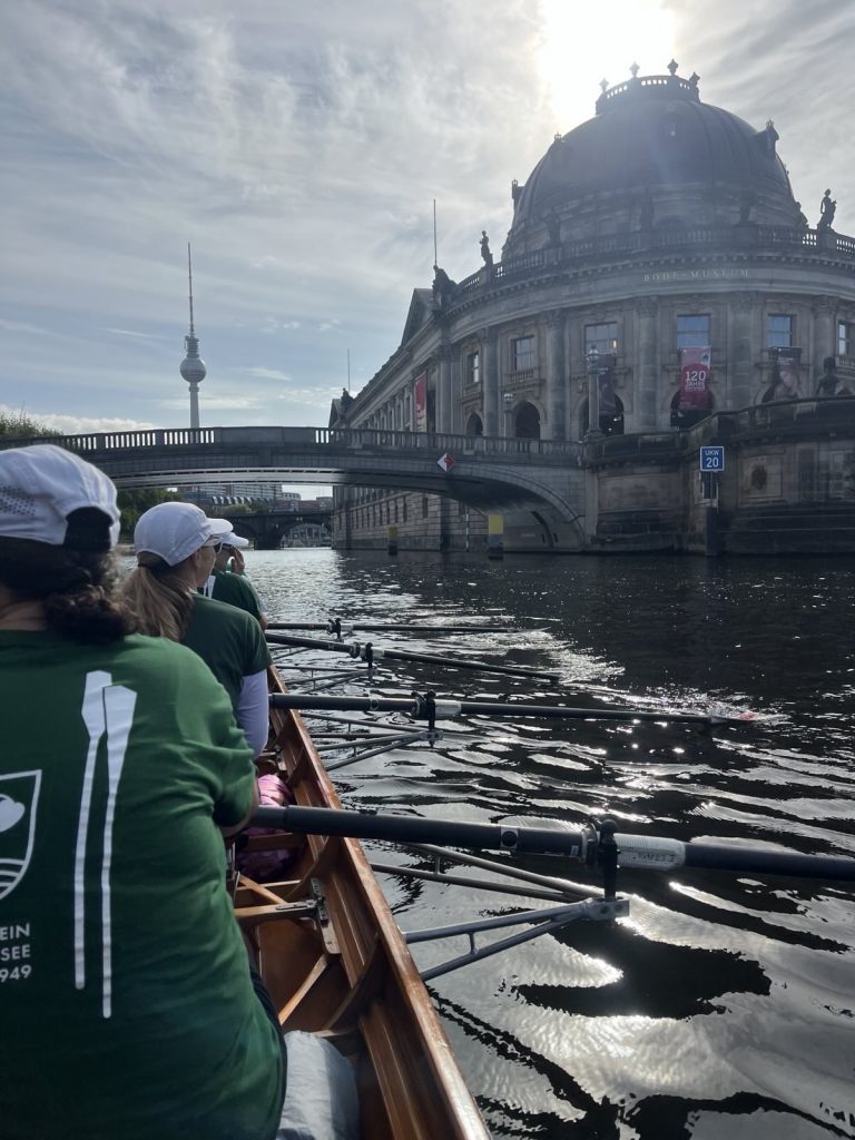 Weiter ging es durch Berlins Wasserstraßen – vorbei an grünen Ufern, Villen und immer wieder überraschenden Perspektiven. Ein kurzer Stopp am Krankenhaus (rein organisatorisch: Toiletten!) unterbrach den Rhythmus, ehe uns ein kräftiger Regenschauer noch einmal zeigte, dass Rudern kein reiner Schönwettersport ist. Nass, aber nicht unterzukriegen, legten wir schließlich bei der RG Wiking an, Rückfahrt mit dem ÖPNV. Den Abend beschlossen wir mit Matjes in Sahnesauce bei Welle Poseidon, und erstaunlich früh fanden sich alle freiwillig wieder in den Betten ein.