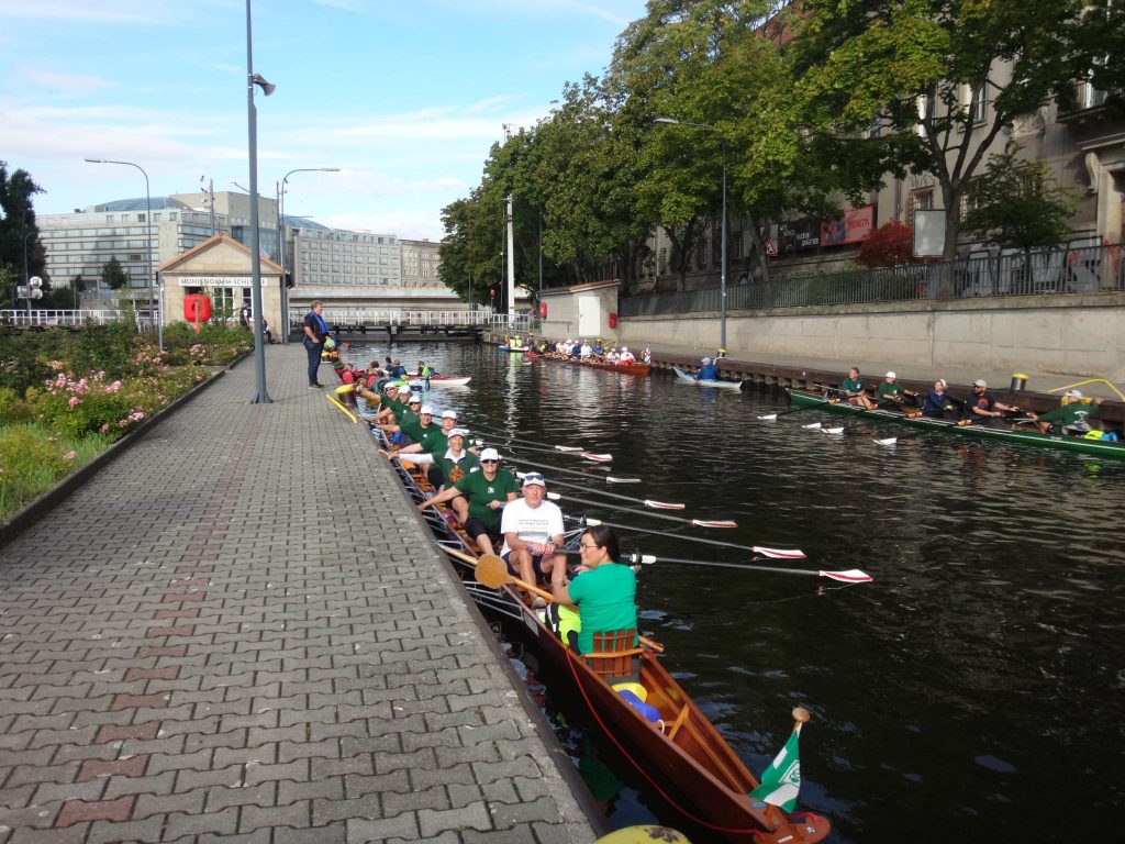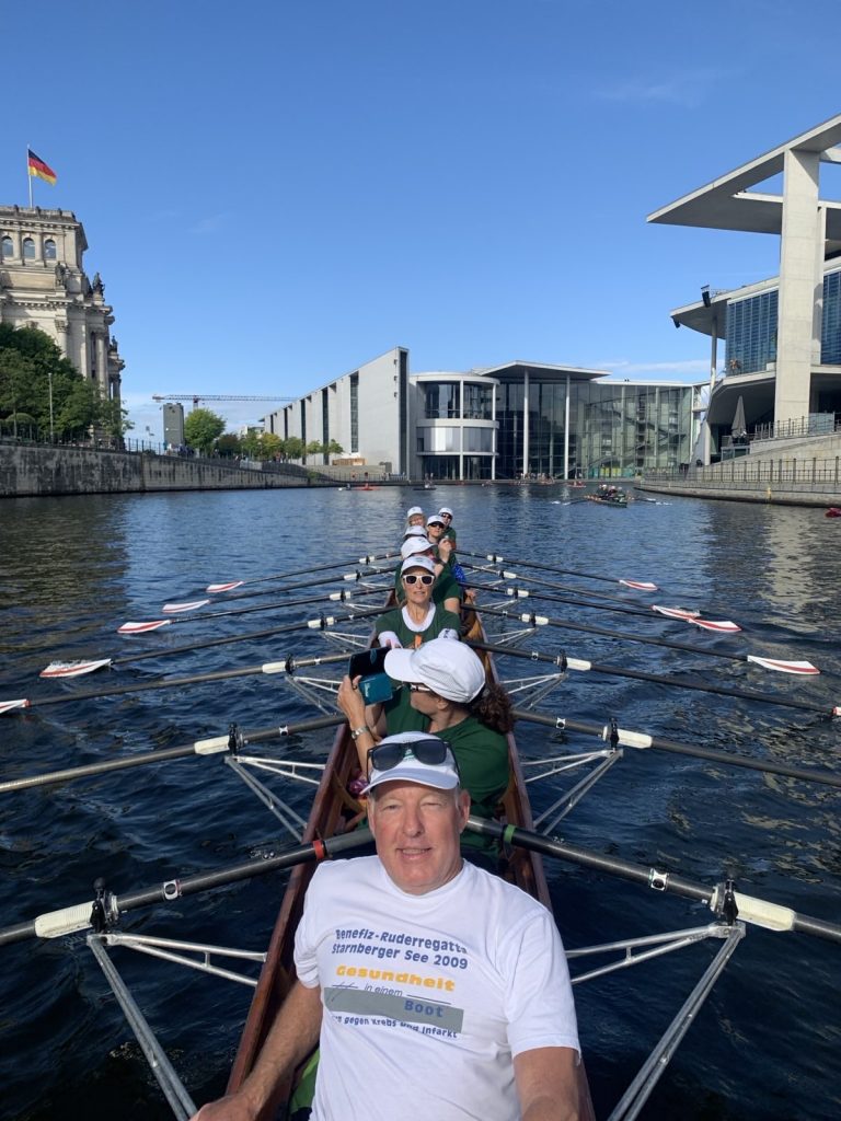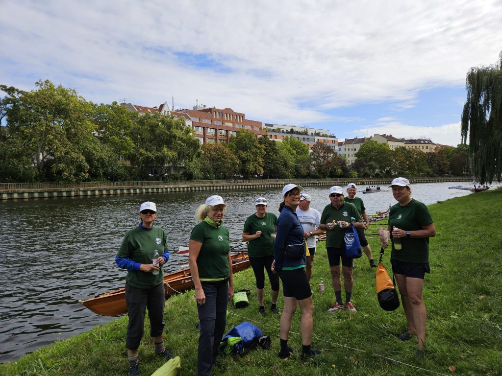 Der Samstag startete früh, allerdings nicht ganz so früh, wie es die sehr preußische Planung vorgesehen hatte: Statt ÖPNV gönnten wir uns den Luxus eines Taxis. Ausschlafen bis fast 6:00 Uhr! Nach einem schnellen Frühstück im Cafe standen wir schon bald am Steg, alles klappte wie am Schnürchen. Pünktlich erreichten wir die Oberbaumbrücke – das erste „Aaahhh“. Und es sollte nicht das letzte bleiben: Museumsinsel, Reichstag, Kanzleramt, Schwangere Auster, Schloss Bellevue – all das einmal vom Wasser aus zu erleben, war schlicht überwältigend. Erst unsere Sitzmuskeln holten uns zurück auf den Boden der Tatsachen. Erleichtert legten wir beim RC Hellas Titania an – Belohnung: kühles Bier, Kaffee und Apfelkuchen. Rückfahrt diesmal mit Bus und Fähre. Ein paar Kulturhungrige besuchten dann noch die benachbarte Liebermann-Villa, bevor nebenan bei Welle Po der legendäre Kurti und die Currywurst warteten.