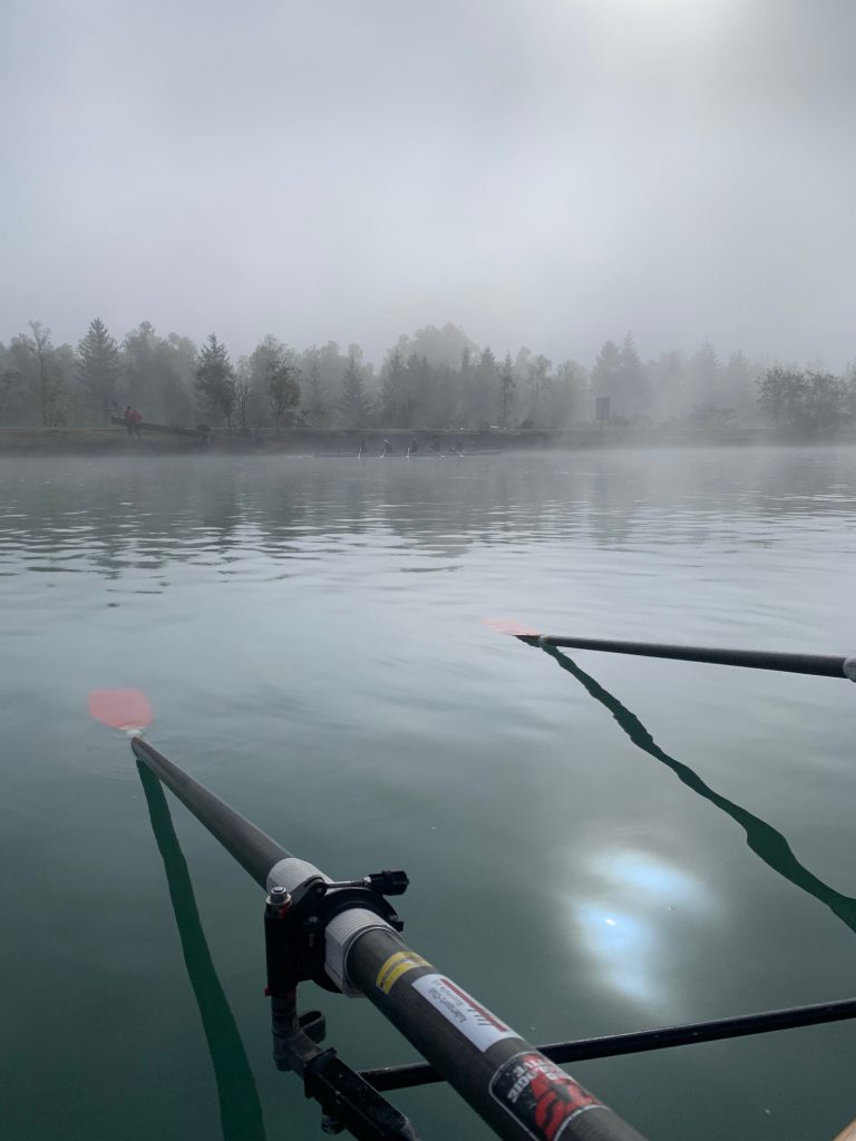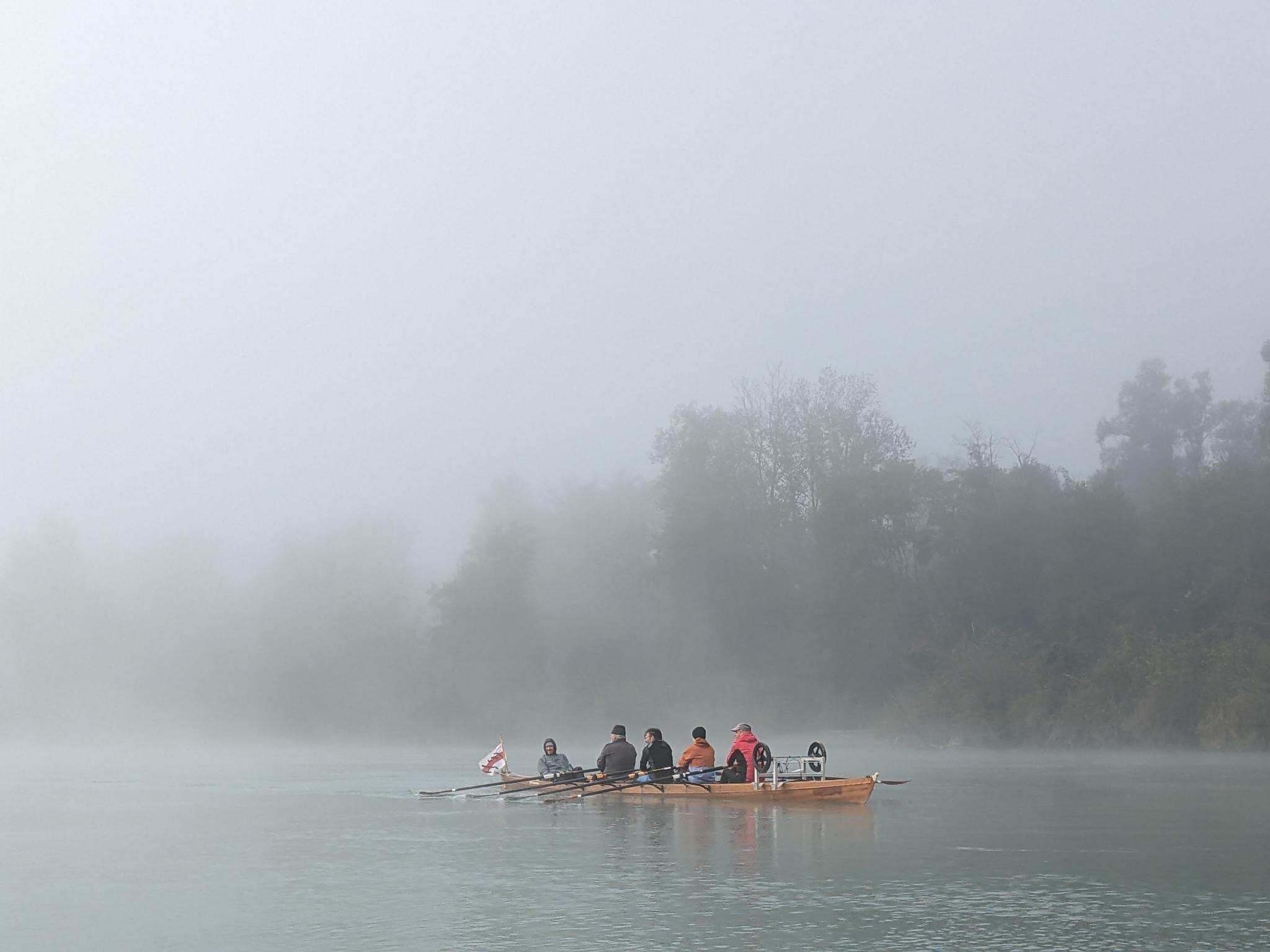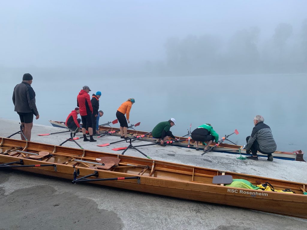 Um 8:00, bei null Grad und dichtem Nebel, standen wir auf dem Vorplatz des RSC und fragten uns, wie die Steuerleute der insgesamt 4 Boote es schaffen sollten, nicht auf ihren Plätzen festzufrieren. Aber Paul, der Organisator, schlug vor, dass einfach möglichst viele Leute rudern, und wir bauten dementsprechend zusätzliche Ruderplätze in drei der Boote ein, so dass am Ende nur noch eine Person Leinen in der Hand halten musste.